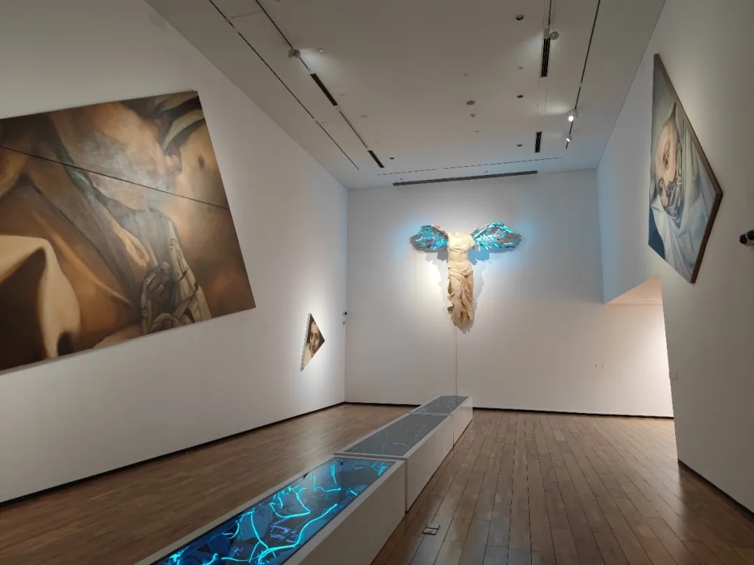 图中间雕塑为庞茂琨作品:《脉息》。该作品将原来的胜利女神的双翼替换成了钢铁,在展厅水泥墙背景和正顶光的肃穆氛围下,象征意味十足。将科技与古典形象结合,仿佛也在暗示艺术家担心科技未来将走向的某种极端趋势。