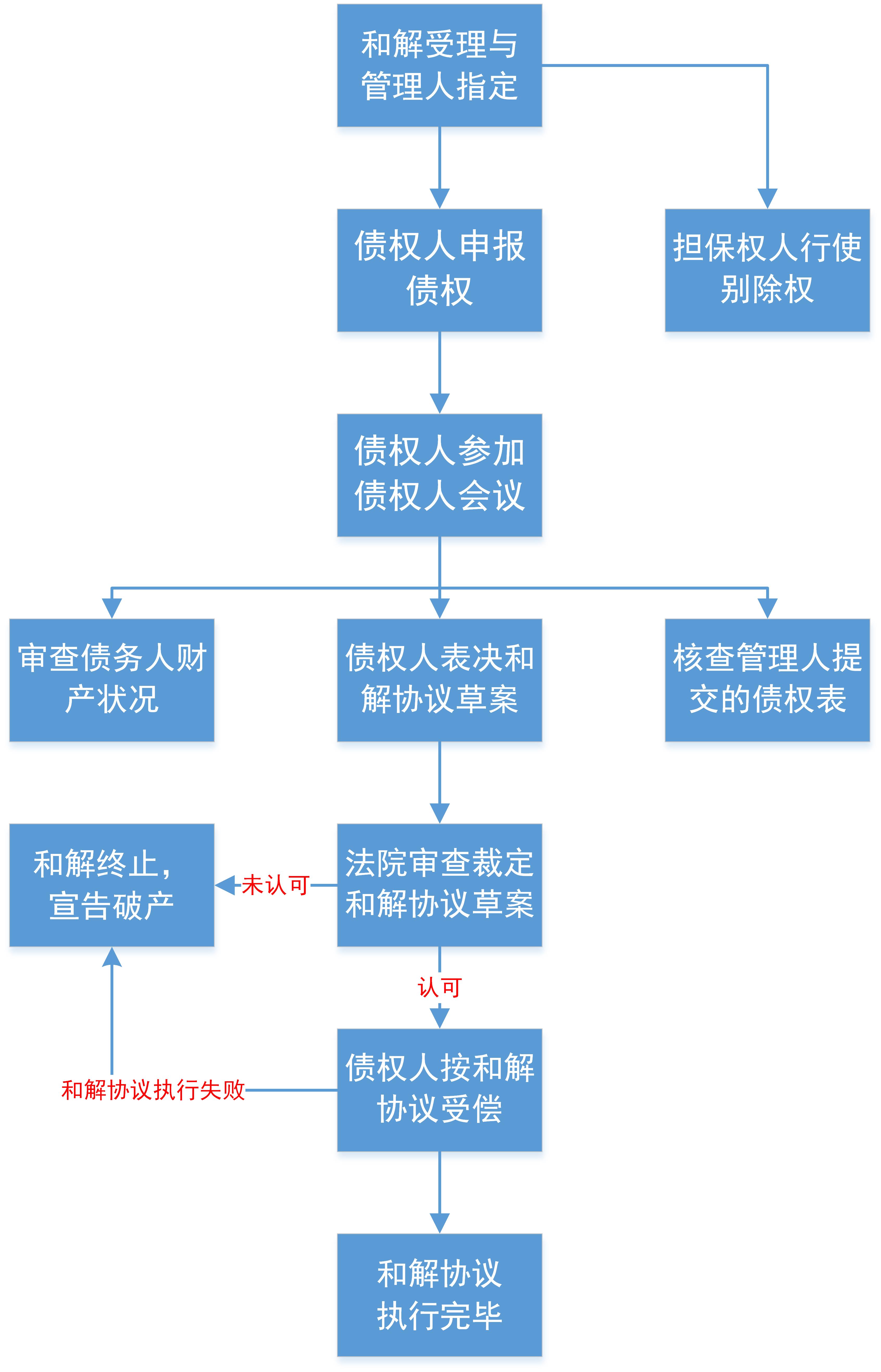 和解,是指经发生破产原因的债务人申请,在法院主持下由其和债权人进行协商,就债务偿还事项制订和解协议草案,经债权人会议表决通过及法院裁定认可后生效,由债务人按和解协议执行,避免债务人破产的法律程序。债权人参与的基本流程如下: